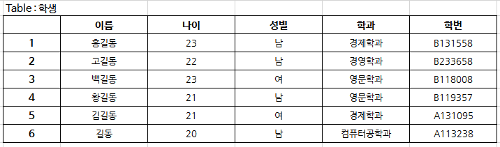 위 테이블을 다시 살펴보자, '고길동' 씨를 찾고 싶을 땐 어떻게 하면 될까? '학생' 테이블의 2번째 인덱스를 참조하면 된다. 하지만 '고길동'이라는 이름을 가진 사람이 2명 이상이면 어떻게 해야 하는가? 이 같은 문제를 해결하고자 관계형 데이터베이스 관리 시스템(RDBMS)에서는 데이터 테이블에 반드시 하나의 키가 되는 컬럼을 두도록 권고하고 있다. 수많은 학생들은 서로 다른 고유의 번호 '학번'을 가지고 있다. unique 한 특징을 가진 '학번'이 바로 '키'가 되어 데이터의 정확성을 보장해주고 올바른 데이터를 유지하게 해주는 것이다.