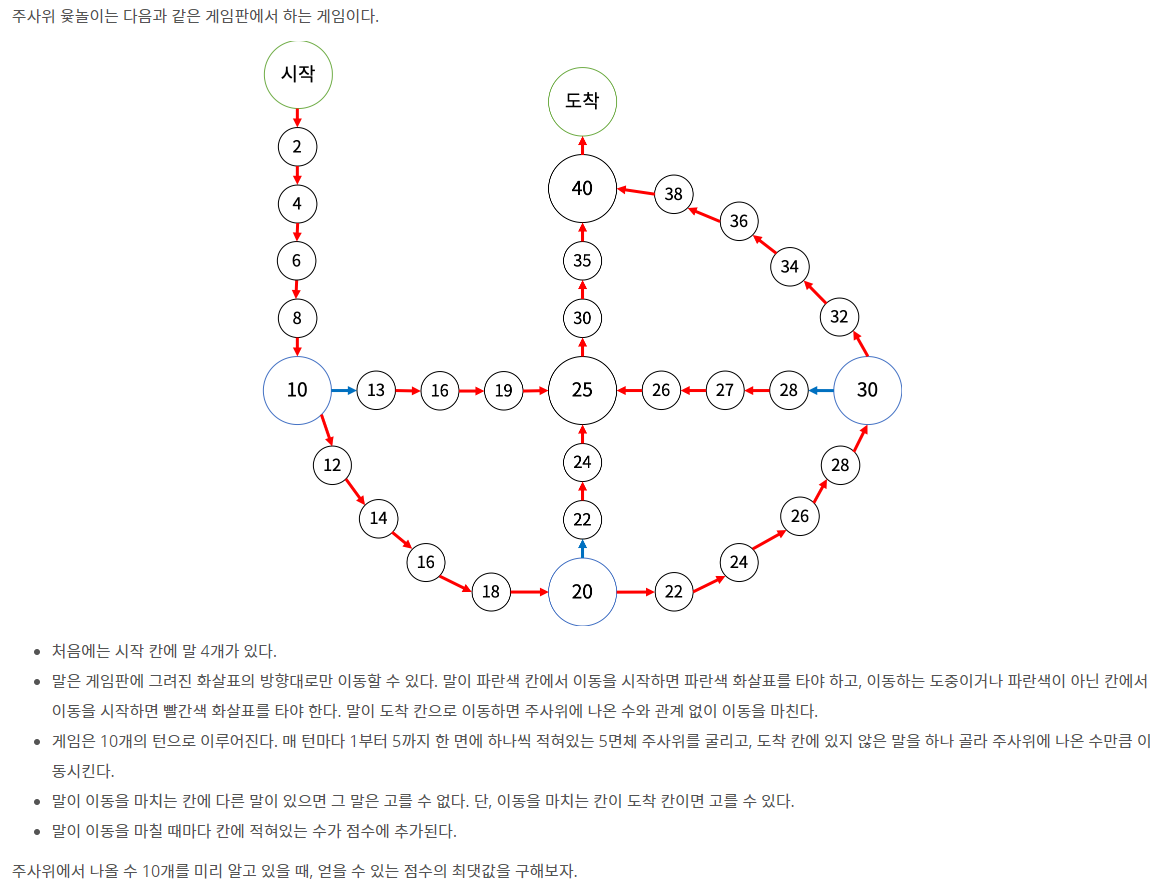 주사위를 굴려 나온 숫자만큼 윷놀이 말을 움직여 가면서 발판에 있는 점수들을 더해 얻을 수 있는 점수의 최대값을 출력하는 문제이다.